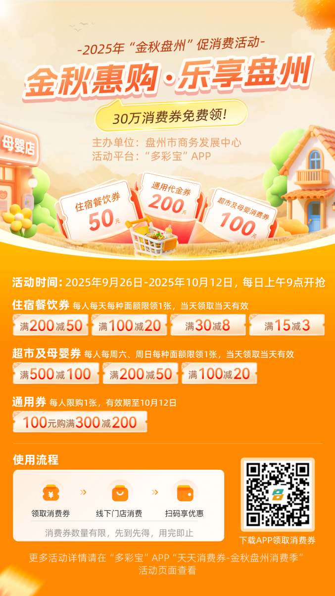 市民和游客可扫描活动二维码或通过“多彩宝”APP进入“金秋盘州消费季”活动专区,即可领取或购买消费券。到店消费时,通过“多彩宝”APP或微信扫描商户“贵商码”,付款时选择相应券码即可直接抵扣,轻松便捷。